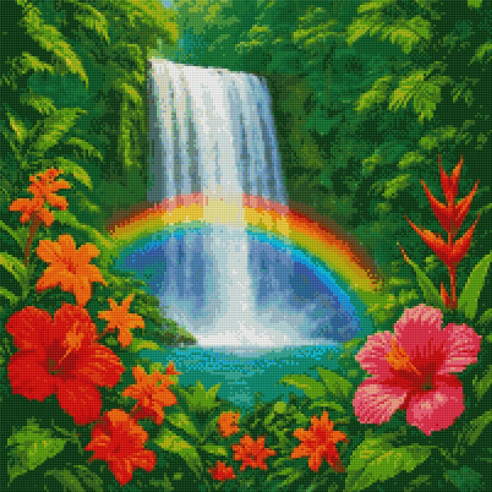 Dive into a tropical sanctuary where nature sparkles in its purest form. Rainbow Falls Paradise transforms every diamond into a breathtaking escape: a crystal-clear waterfall flowing through lush jungle greenery, vibrant tropical blooms framing the scene, and a perfect rainbow casting its magical glow across the water.