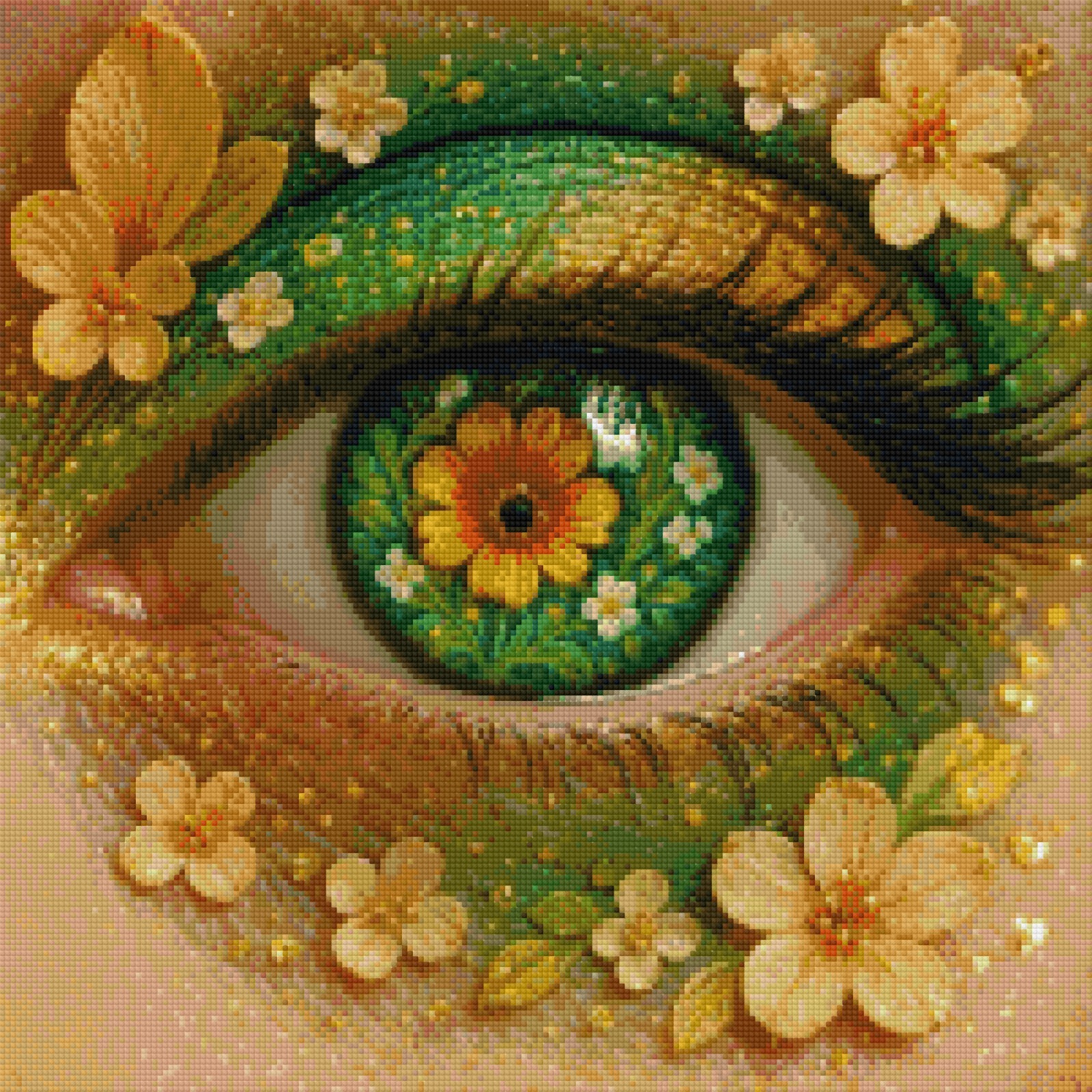 Discover the beauty that blooms within the gaze with Garden in Her Eyes, a deeply artistic and captivating canvas. Every detail unveils a hidden world: golden petals adorning the skin, shimmering accents blending into emerald tones, and at the center, an eye that holds an entire garden within its depths.
