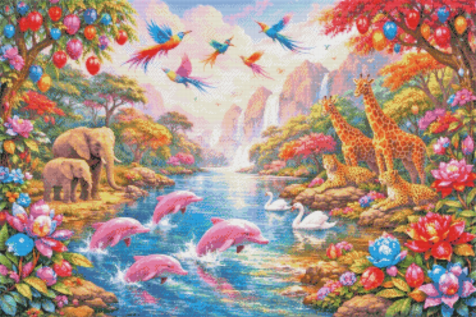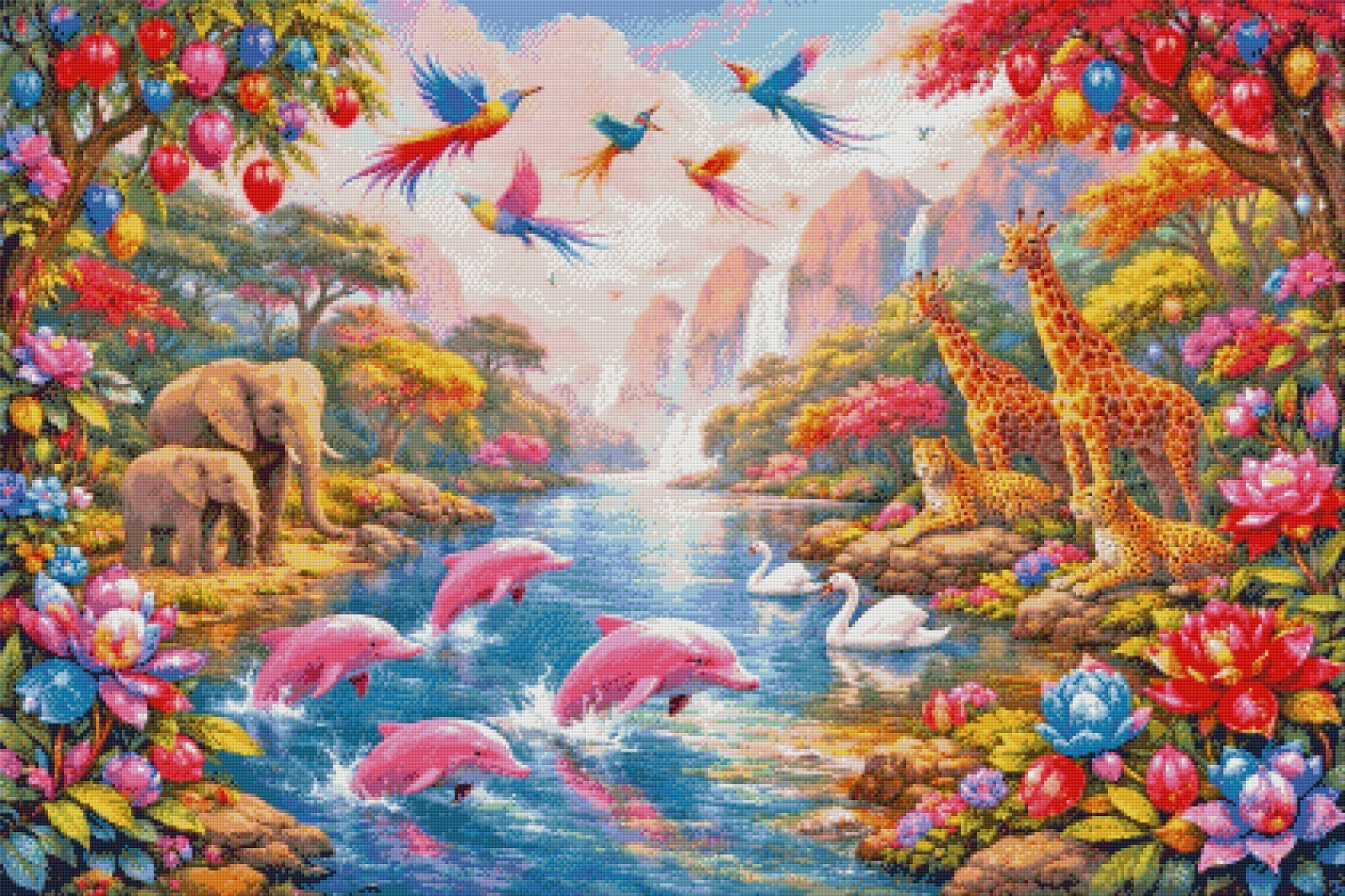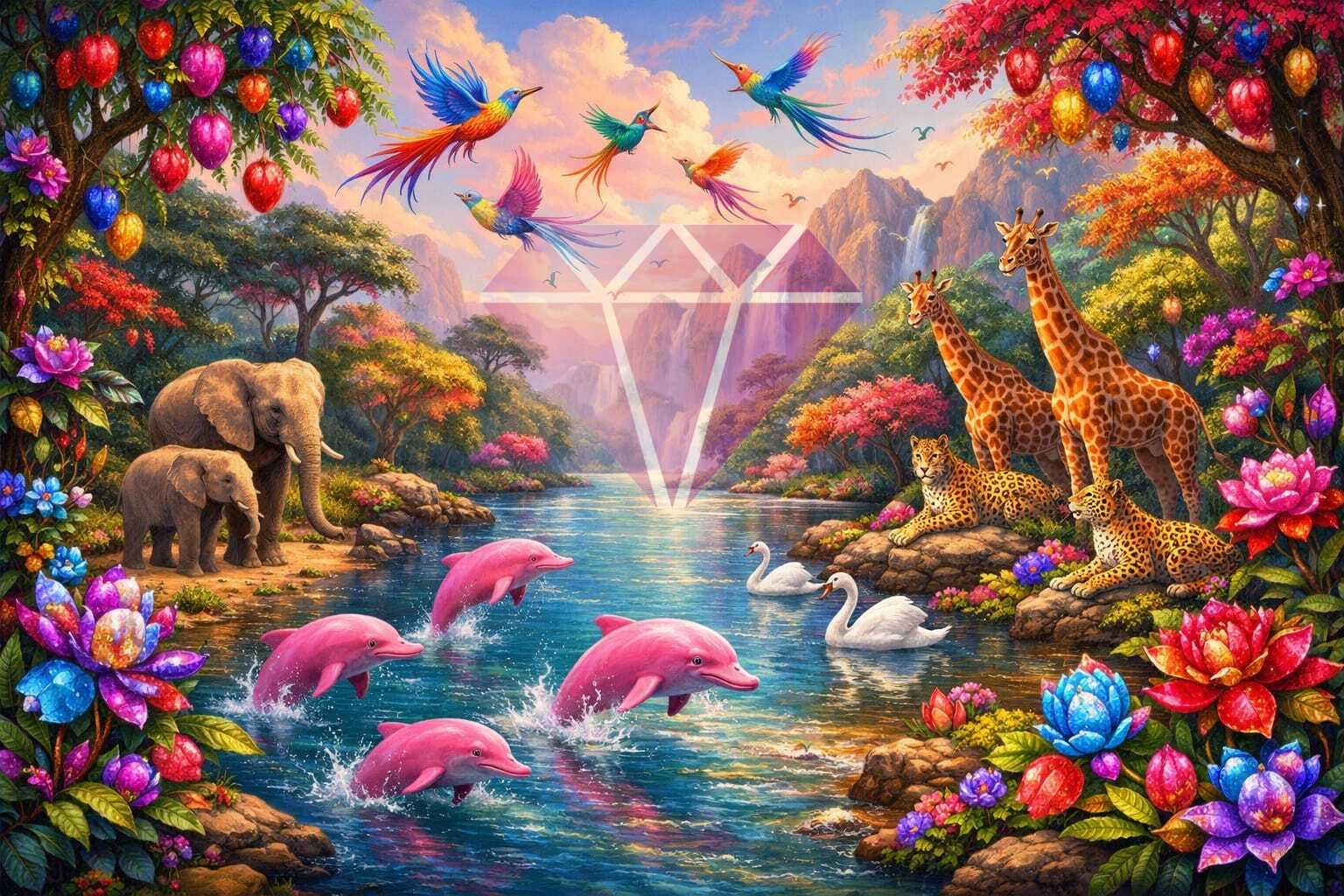 In this breathtaking artwork, a radiant valley unfolds beneath pastel mountains and a glowing sky. The crystal‑clear river becomes the heart of this enchanted haven, where joyful pink dolphins leap playfully among shimmering reflections. On the riverbanks, elegant swans glide peacefully while gentle elephants, graceful giraffes, and watchful leopards rest surrounded by lush vegetation.