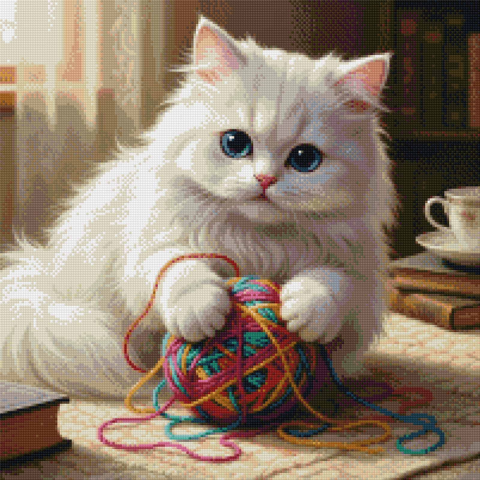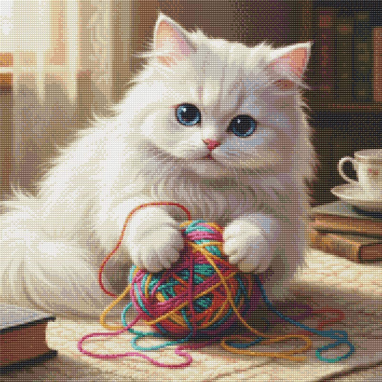 🐱 Fluffy Yarn Dreams from the Cuteness Unleashed Collection by DJPinyPon exclusive for Diamond Painting Portugal is a heartwarming scene of pure coziness and charm. A fluffy white cat sits gracefully on a table, gently holding a vibrant ball of yarn with playful curiosity. Surrounding details like books and a teacup add a touch of homely warmth, while soft daylight streams through the window, creating a serene and inviting atmosphere. This artwork perfectly captures the joy of simple moments and the comforting beauty of winter days indoors.