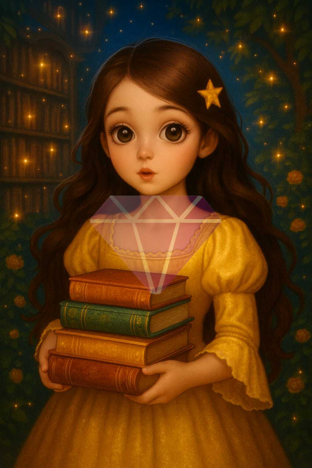Among enchanted pages and lights that twinkle like whispered secrets, Bela rises as the guardian of timeless tales. Her golden dress glows like the sun of a distant realm, and the books she holds are keys to worlds where love transforms, courage frees, and magic never sleeps. An ode to enchanted wisdom, where every sparkle is a promise of wonder.