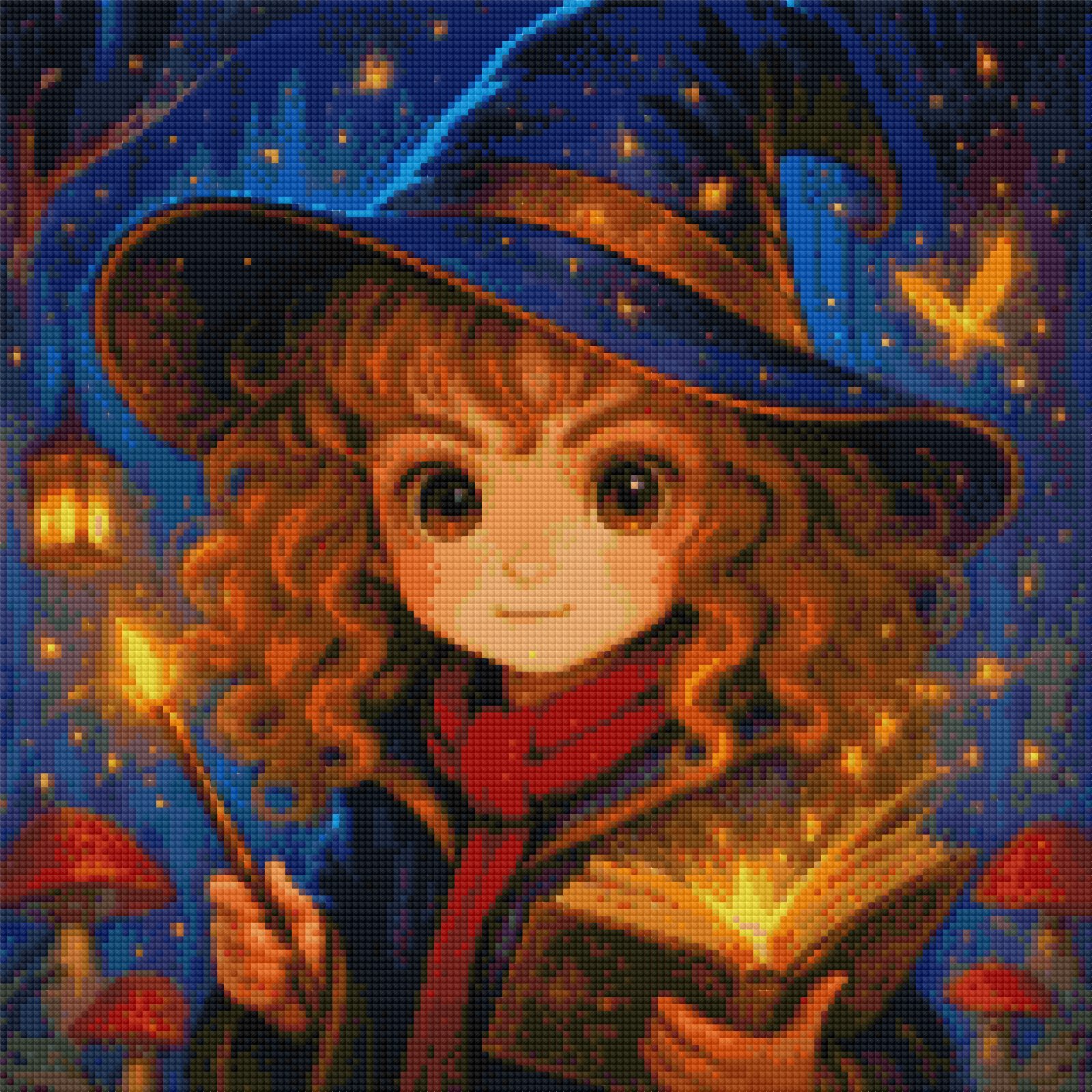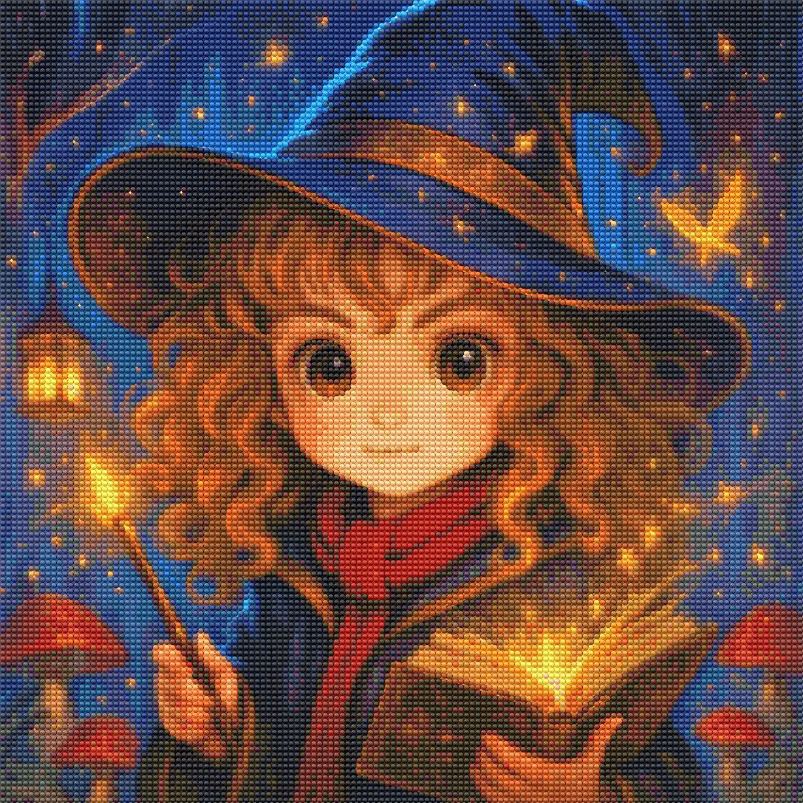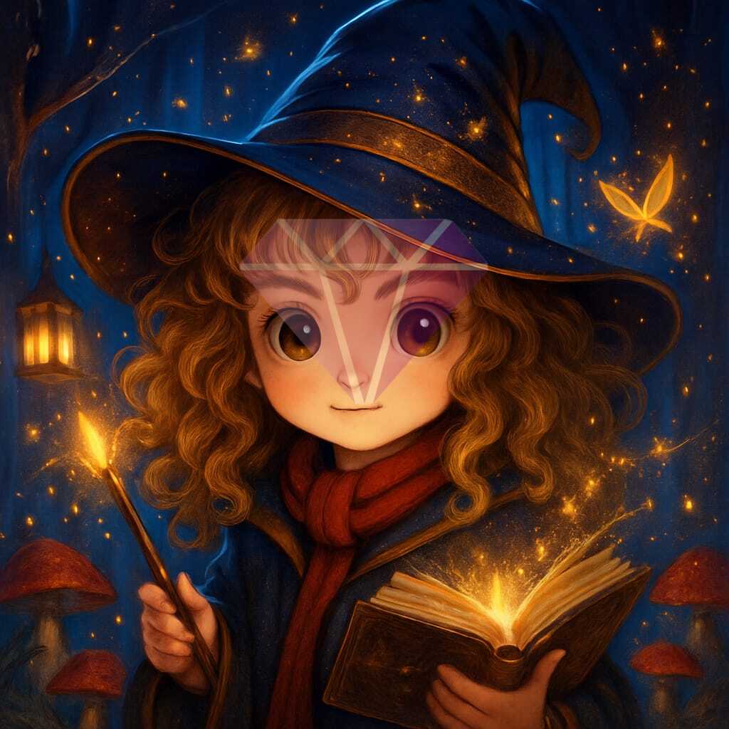 Com um livro mágico aberto nas mãos e a ponta da varinha iluminada, Hermione Granger mergulha num momento de pura concentração e sabedoria. O seu chapéu pontiagudo e os cabelos encaracolados reforçam a sua identidade única, enquanto partículas brilhantes flutuam ao seu redor, iluminando cogumelos e lanternas numa floresta encantada. Esta imagem é um tributo à inteligência, determinação e magia da bruxa mais brilhante da sua geração.