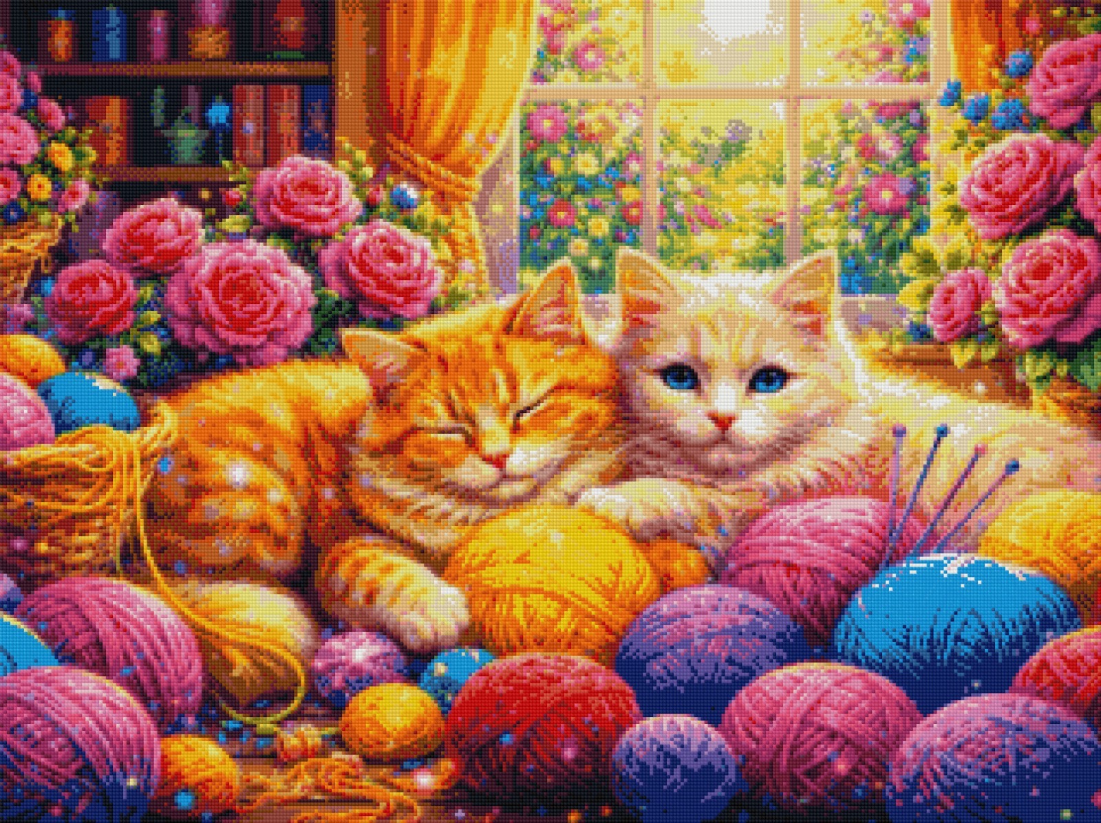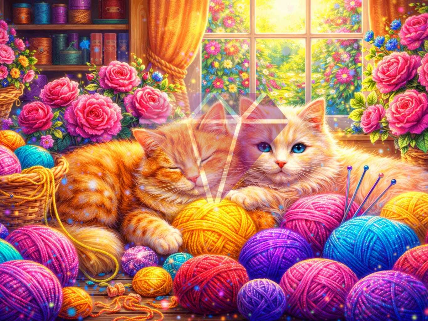 A warm and enchanting scene where comfort meets creativity. Whiskers & Wool Dreams from the My Happy things Collection by DJPinyPon exclusive for Diamond Painting Portugal, captures two adorable cats nestled among colorful yarn balls, surrounded by blooming flowers and the gentle glow of a sunlit window. The vibrant threads, cozy textures, and peaceful expressions create a dreamy atmosphere that feels like a perfect afternoon in a knitter’s paradise.
