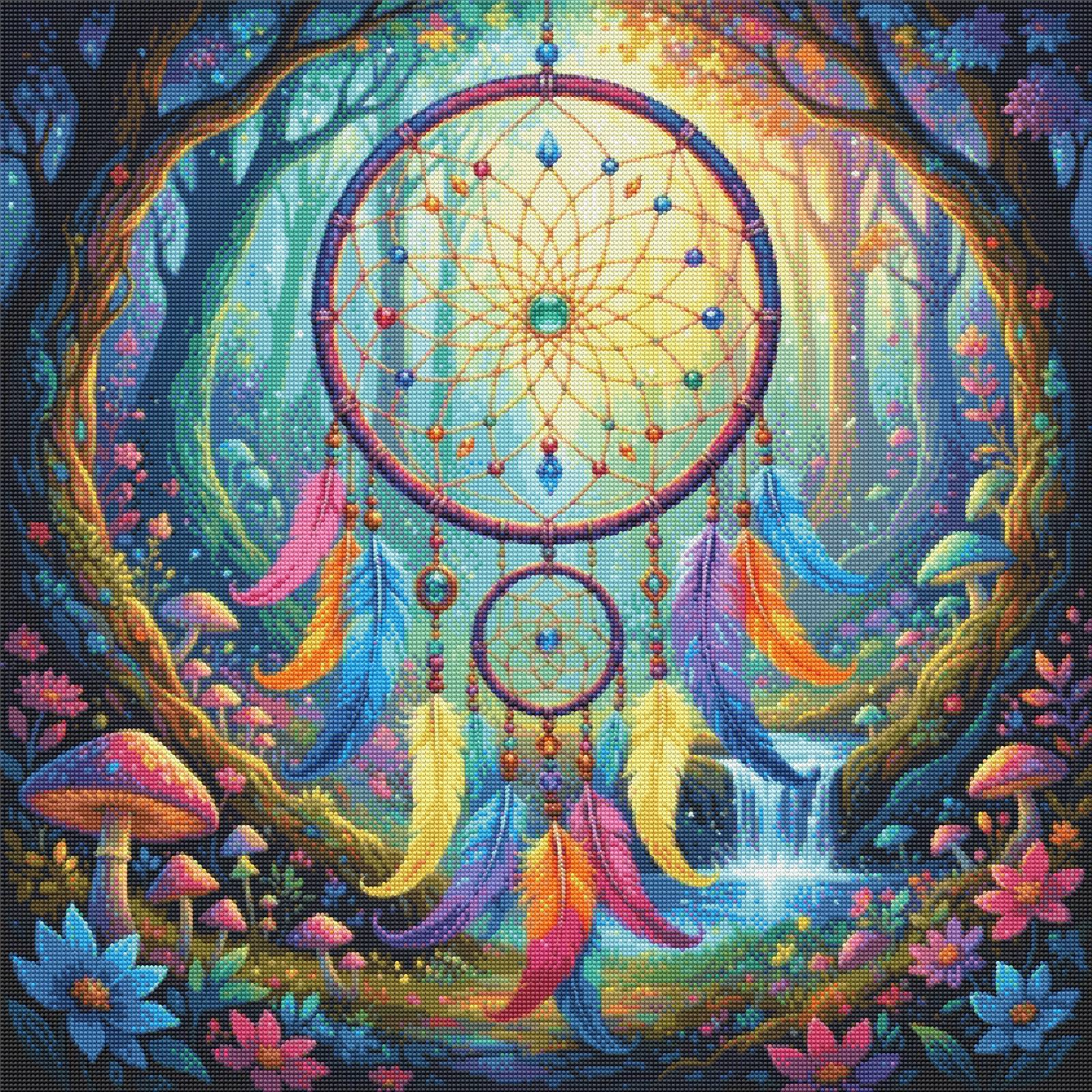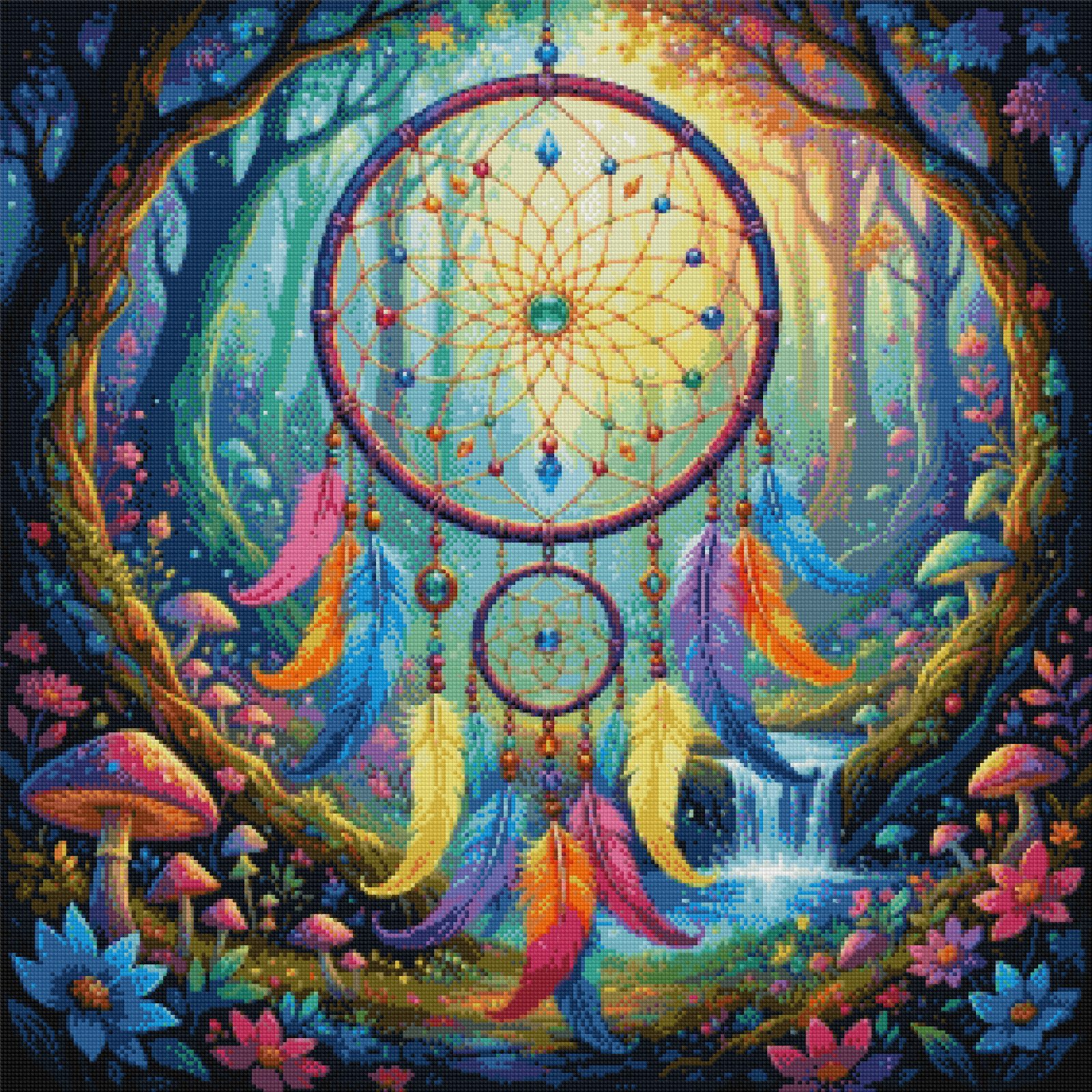 🪬 Sacred Threads from the Sacred Realms collection by DJPinyPon, exclusive for Diamond Painting Portugal, this magical artwork features a radiant dreamcatcher suspended in an enchanted forest. Adorned with vibrant feathers and shimmering beads, it hangs among glowing mushrooms, blooming flowers, and cascading waters. A celebration of serenity, protection, and the sacred beauty of nature’s spiritual tapestry.