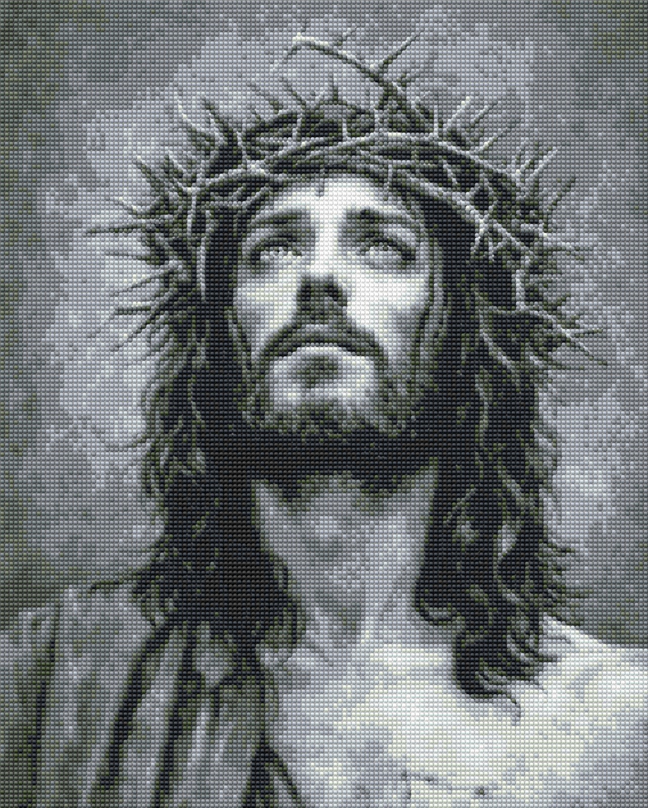 The Redeemer’s Passion é uma representação monocromática poderosa que transmite a profundidade solene do sacrifício e da devoção. A figura surge com uma coroa de espinhos detalhada, com madeixas de cabelo caindo naturalmente sobre os ombros e um tecido simples drapeado sobre o peito. Os tons cinzentos reforçam a luz dramática, evidenciando a textura dos espinhos e os contornos da composição. Uma tela que evoca reverência, espiritualidade e o profundo simbolismo da redenção.