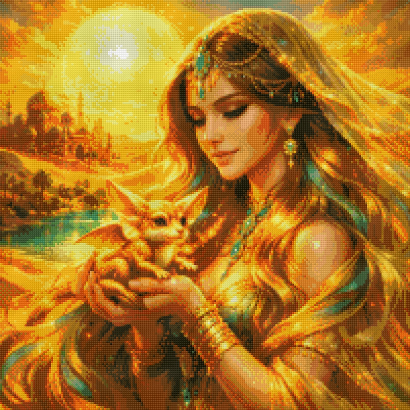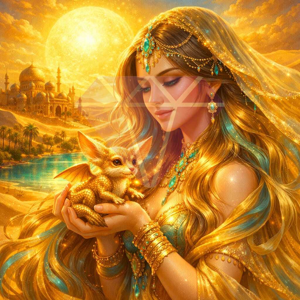 🏜️Oasis of Eternal Light da coleção She Reins by DJPinyPon para a Diamond Painting Portugal transporta‑te para um reino dourado onde a fantasia encontra a serenidade do deserto.