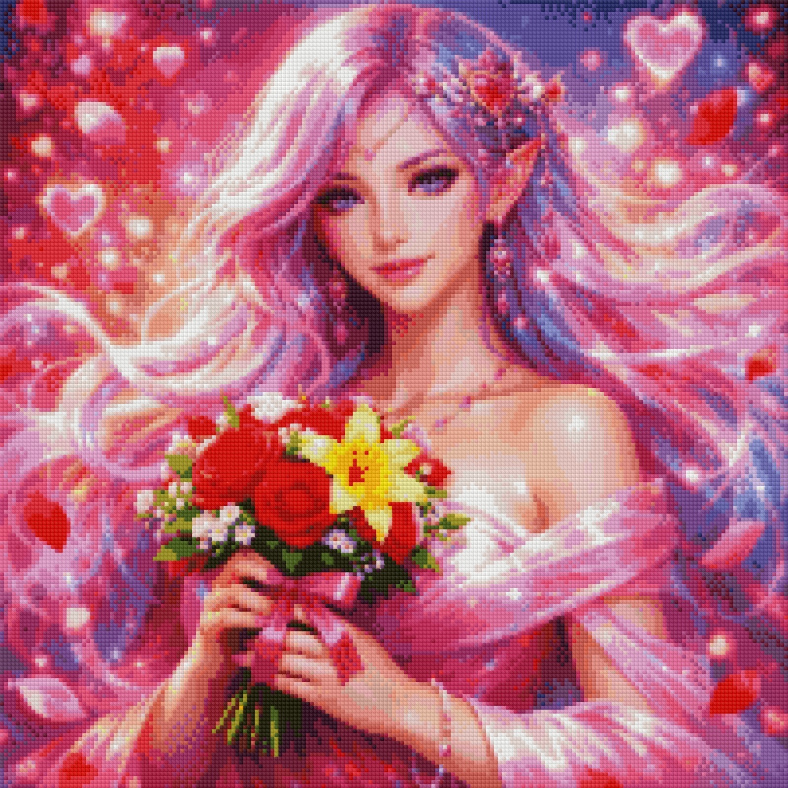 Envolta num véu de tons rosa, lilás e dourado, esta figura etérea segura um magnífico ramo de flores, irradiando elegância, beleza e uma aura encantada.