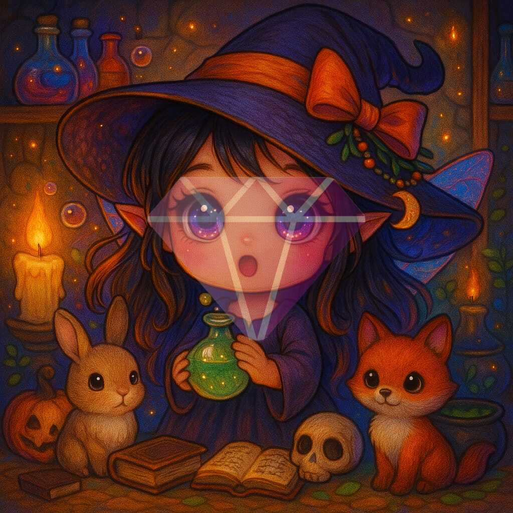 Num cantinho mágico repleto de mistérios e alquimia, vive uma jovem bruxa rodeada pelos seus fiéis companheiros — um coelho curioso e um gato sábio. Entre livros antigos, frascos cintilantes e plantas encantadas, ela guarda os segredos das poções mais poderosas. Com um toque de doçura e sabedoria, Potion Keeper é uma celebração da magia tranquila, da curiosidade e da beleza dos pequenos rituais mágicos do dia a dia.