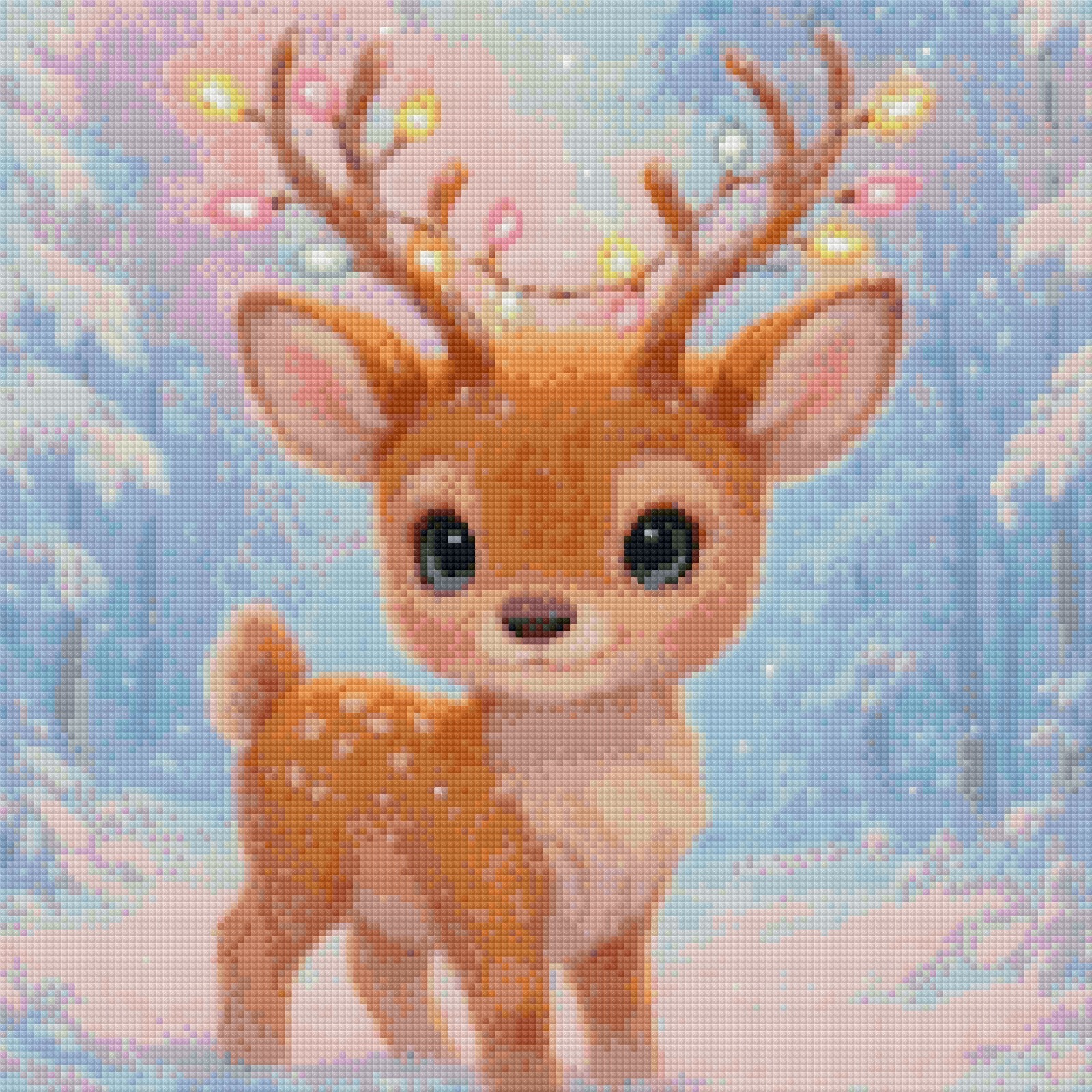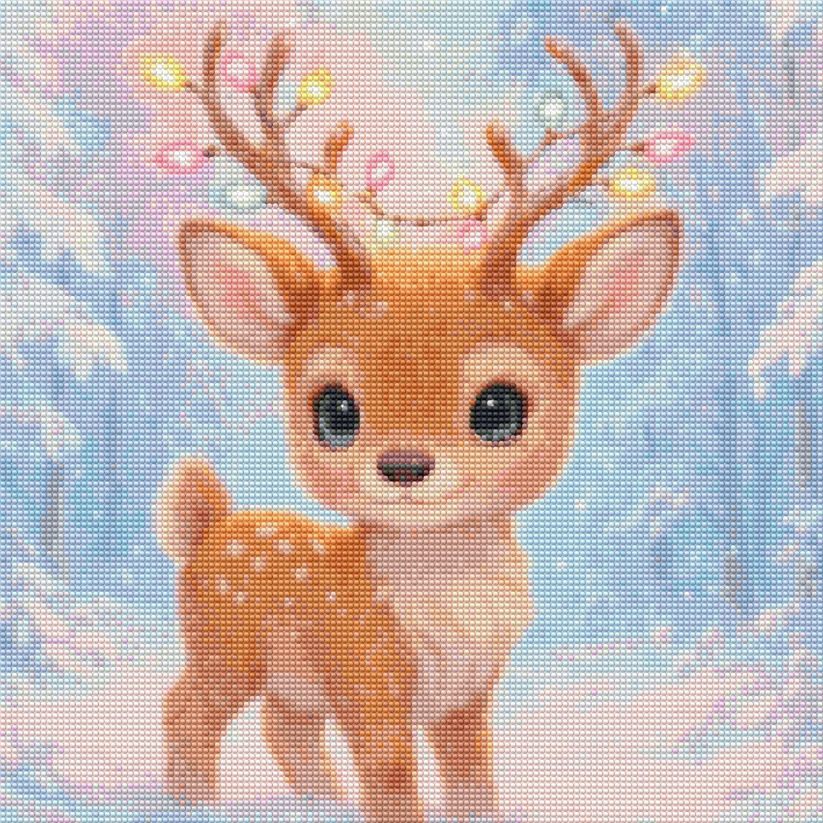 🦌Twinkle Antlers da coleção Holy Jolly Dreams by DJPinyPon em exclusivo para a Diamond Painting Portugal transmite a magia pura das festas de inverno com um adorável filhote de veado numa floresta coberta de neve. Os seus olhos grandes e brilhantes refletem inocência e encanto, enquanto os chifres decorados com luzes coloridas iluminam suavemente o cenário gelado. Os tons pastel e a queda delicada de neve criam uma atmosfera festiva e encantadora, tornando esta tela uma celebração perfeita de alegria e magia.
