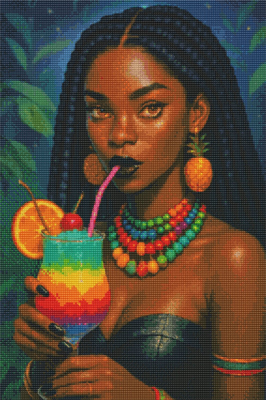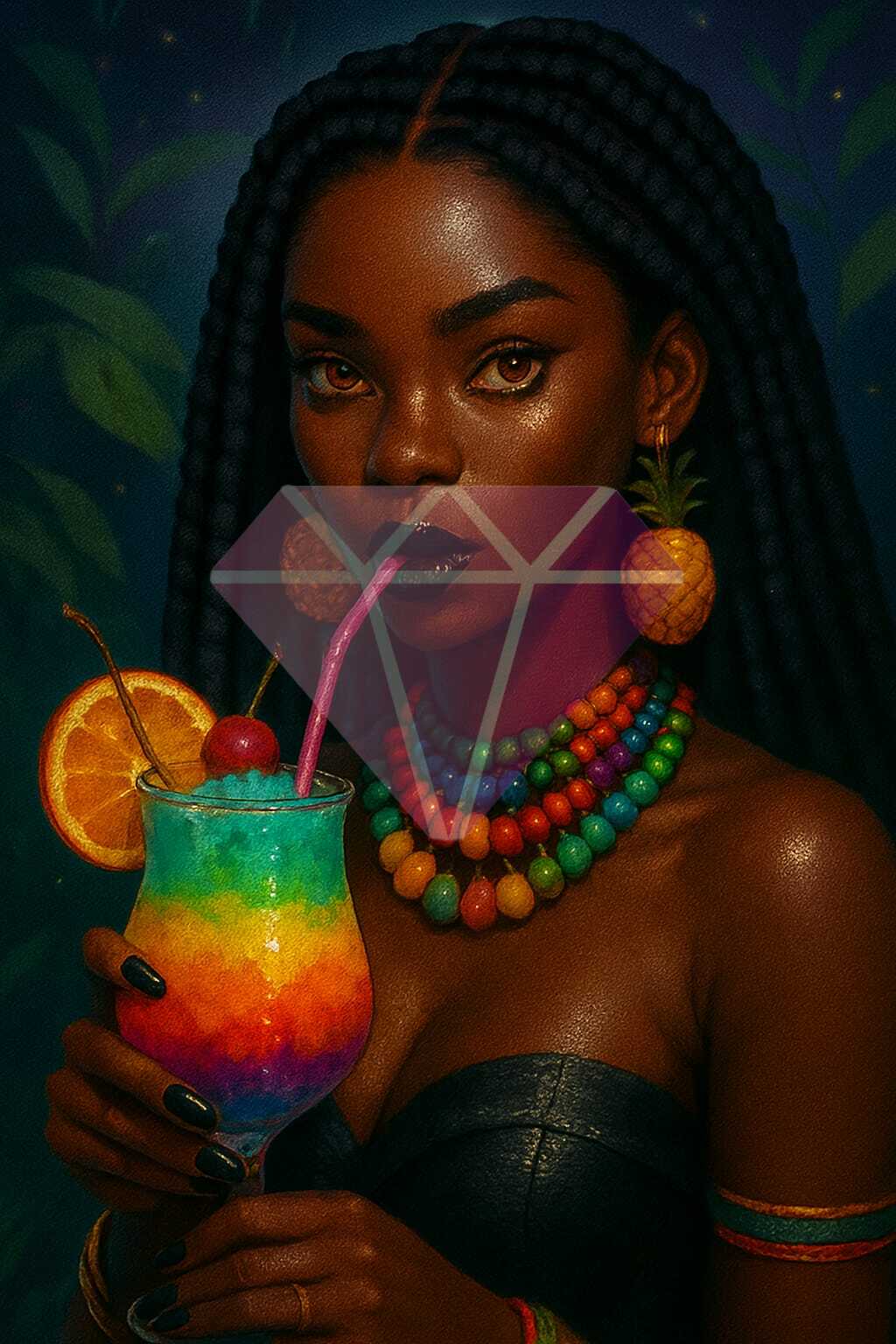 Uma celebração vibrante da força feminina envolta em cores tropicais. Esta imagem apresenta uma mulher majestosa adornada com elementos exóticos — flores tropicais, folhas exuberantes e tons quentes que evocam o pôr do sol numa ilha paradisíaca. O seu olhar transmite confiança e serenidade, como uma rainha que reina sobre um mundo de natureza selvagem e beleza intensa. “Tropical Queen” é uma ode à feminilidade poderosa, à liberdade e ao espírito vibrante das terras tropicais.