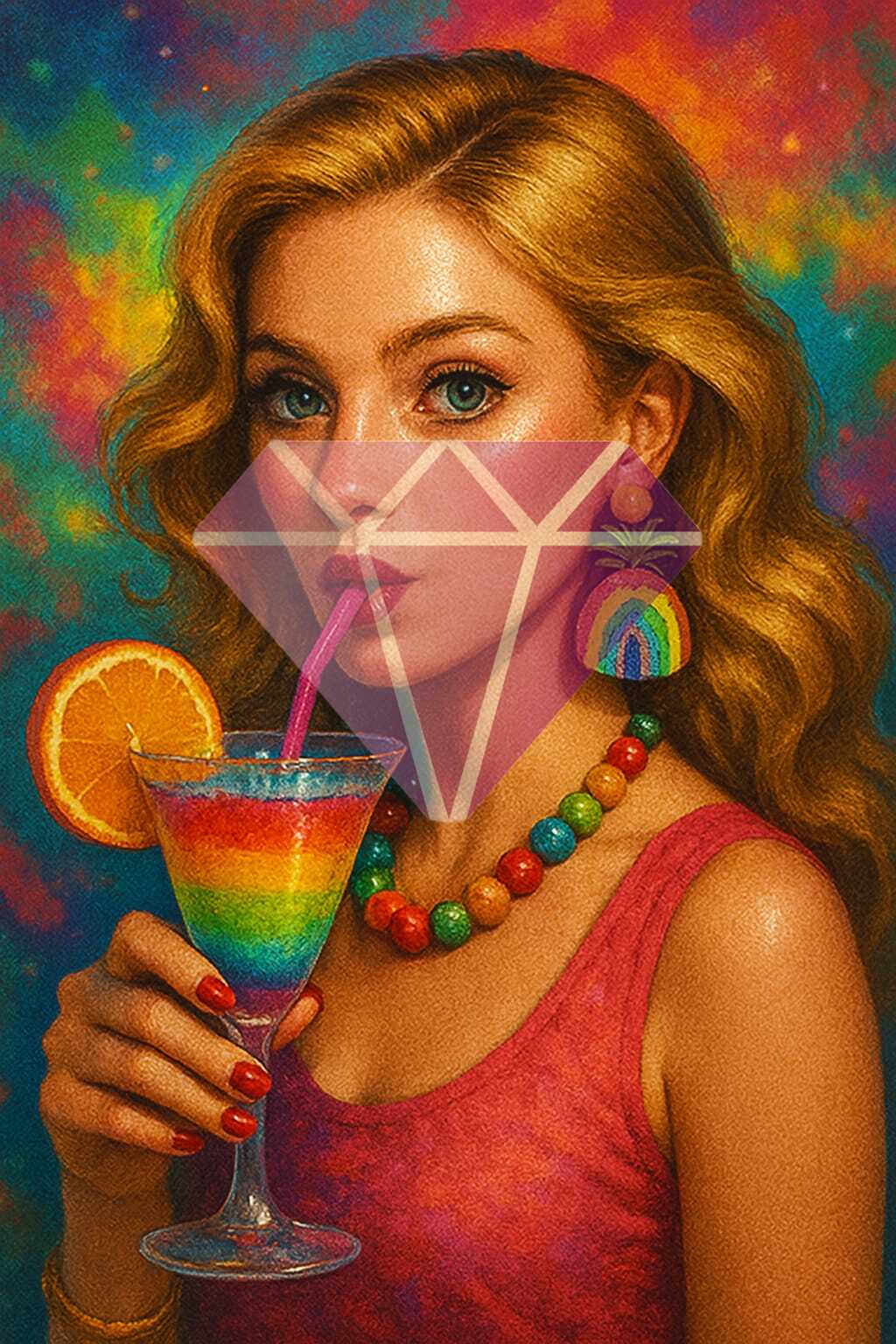 Um brinde à extravagância dos sentidos. Velvet Cocktail é uma explosão líquida de cor e atitude, onde cada camada revela um segredo doce e cada acessório é uma afirmação de estilo. É o sabor da ousadia servido num copo de arco-íris, com um toque cítrico de irreverência e um fundo que dança entre o sonho e o delírio. Uma celebração visual que mistura glamour e liberdade.